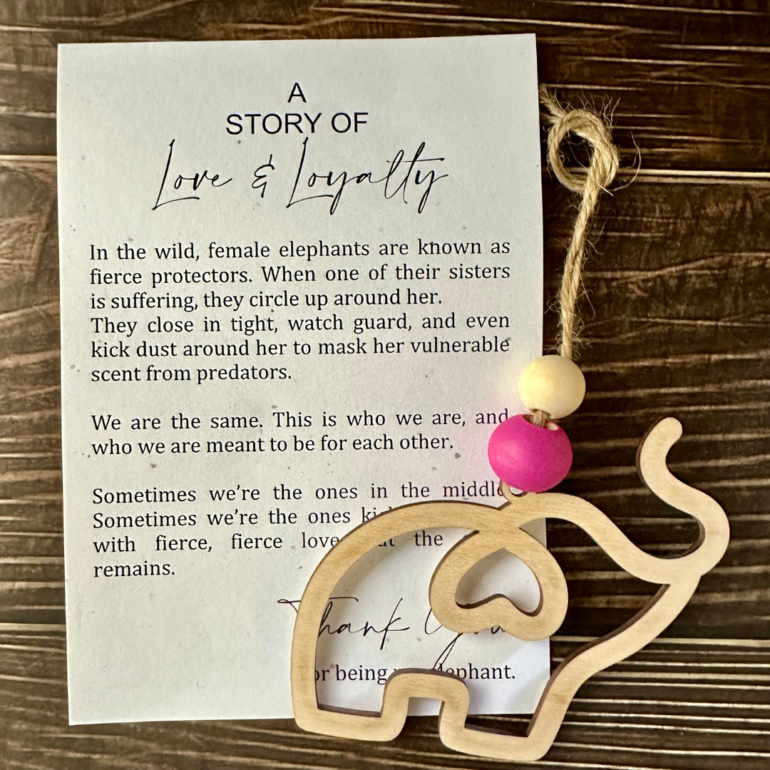 The Sisterhood Elephant Ornament is approximately 3.5” x 4" and includes a wooden bead and twine.